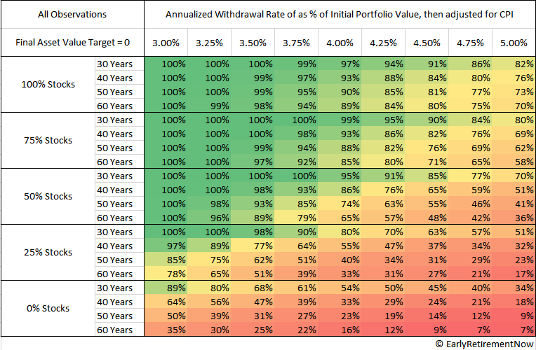 株式比率や取り崩し率の違いによって、資産が枯渇せずに維持できる確率がどのように変動するかを示したものがトリニティ・スタディの成功率表である。