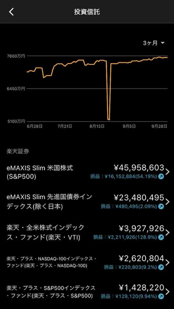 過去3か月の資産曲線を確認すると、8月下旬のリバランスによる一時的な現金化を経て、9月以降は再び右肩上がりの推移を描いている。9月26日時点では7,700万円台後半で安定し、株式と債券の役割分担が明確に機能していることがわかる。