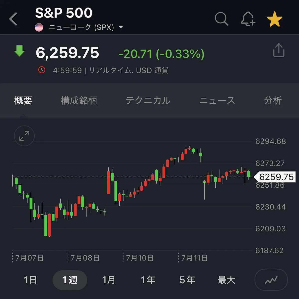 2025年7月7日週のS&P500は、7月10日に史上最高値を更新したものの、6週連続の上昇から一転して前週比-0.31%の小幅反落となり、6,259.75ポイントで週を終えた。