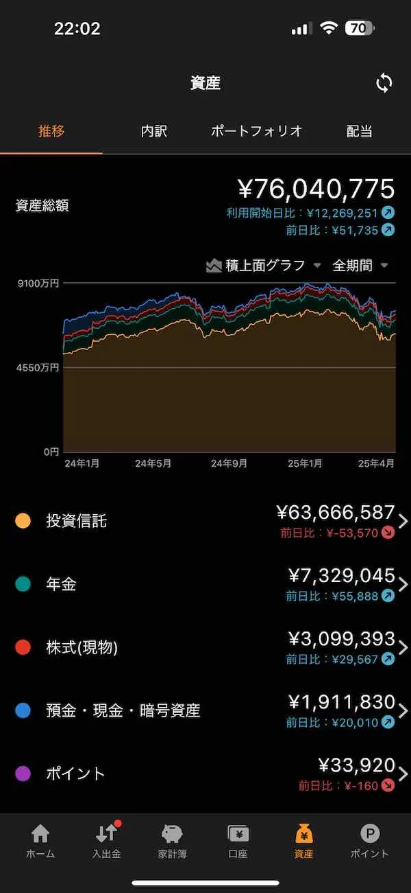 2025年4月末時点での金融資産総額は76,040,775円であった。これは、前月末の82,237,408円と比較して約620万円の減少となっている。