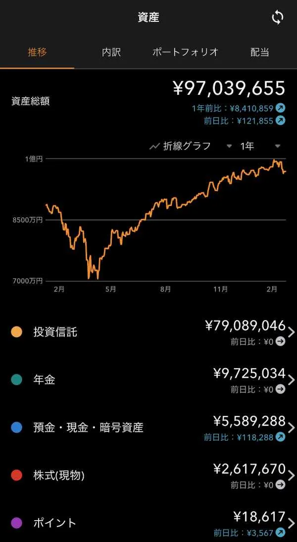 これは前述の通り、投資信託売却後の余剰資金をあえて現金として残したためである。現在の総資産約9,693万円に対し、現金比率は約5〜6%である。