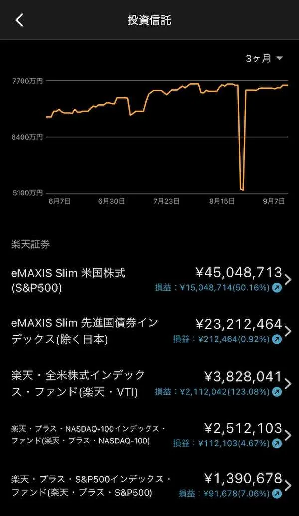 資産推移を振り返ると、8月下旬にリバランスに伴う現金化の影響で一時的に大きな下げが見られた。その後は再び上昇に転じ、9月5日時点では7,700万円前後で安定して推移している。ポートフォリオの再編によって、株式と債券がバランス良く機能していることが確認できる。