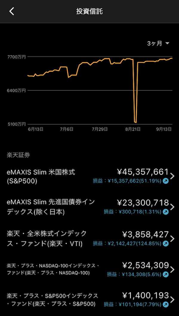 過去3か月の資産推移を振り返ると、8月下旬にリバランスに伴う現金化で一時的な下げがあったものの、その後は安定的に右肩上がりを示している。9月12日時点では再び7,700万円台に到達し、株式と債券のバランスがうまく機能していることが確認できる。