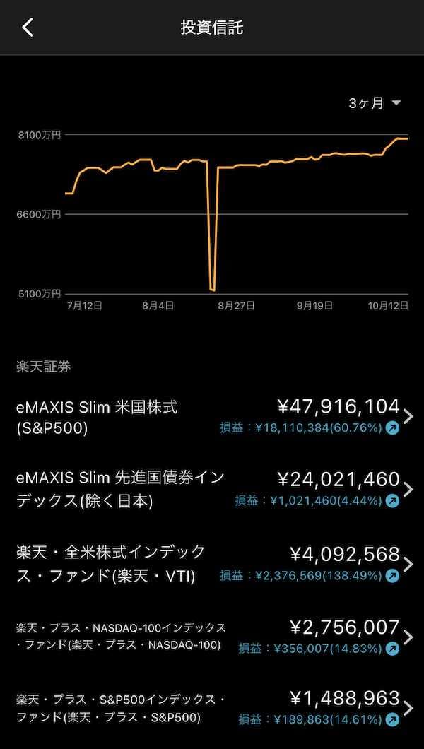 今回の記事では、2025年10月10日時点の投資信託資産の内訳と推移を確認していく。なお、現金やiDeCoは含まれておらず、投資信託のみの資産である。