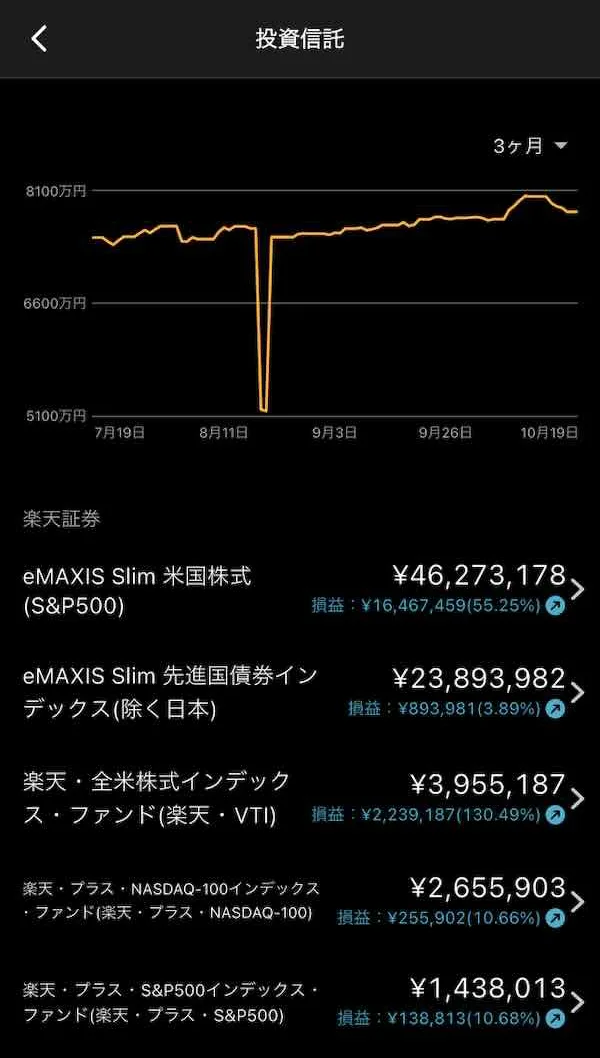 グラフを見ると、8月のリバランスによる一時的な現金化後、9月以降は上昇基調が続いていたが、10月中旬にかけて小幅な調整が入ったことが分かる。下落幅は限定的であり、債券の安定性が全体の資産を支えている。株式偏重だった夏と比べ、より安定感のある推移を描いている点が特徴だ。