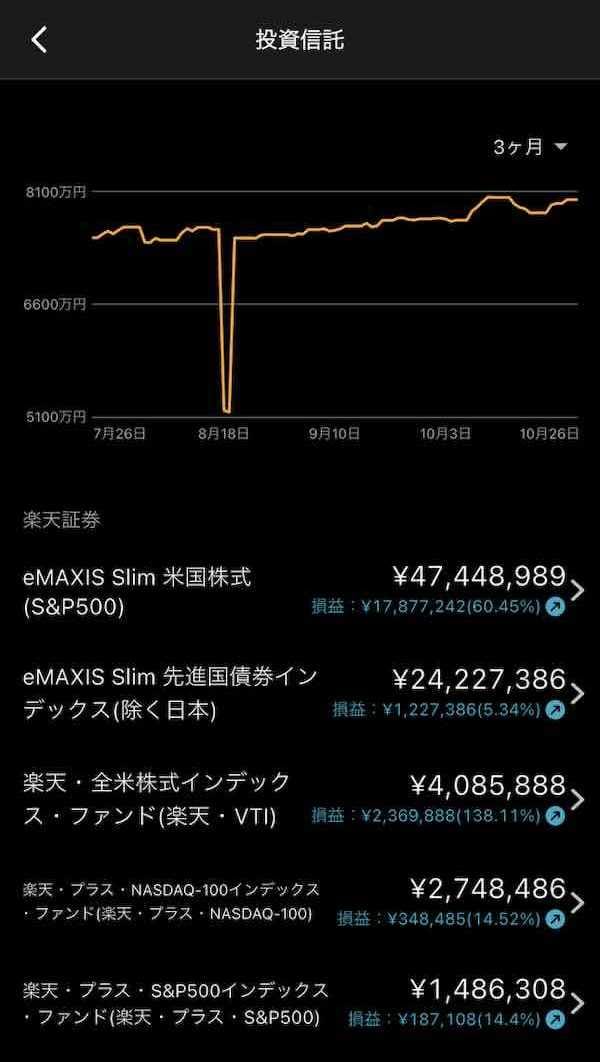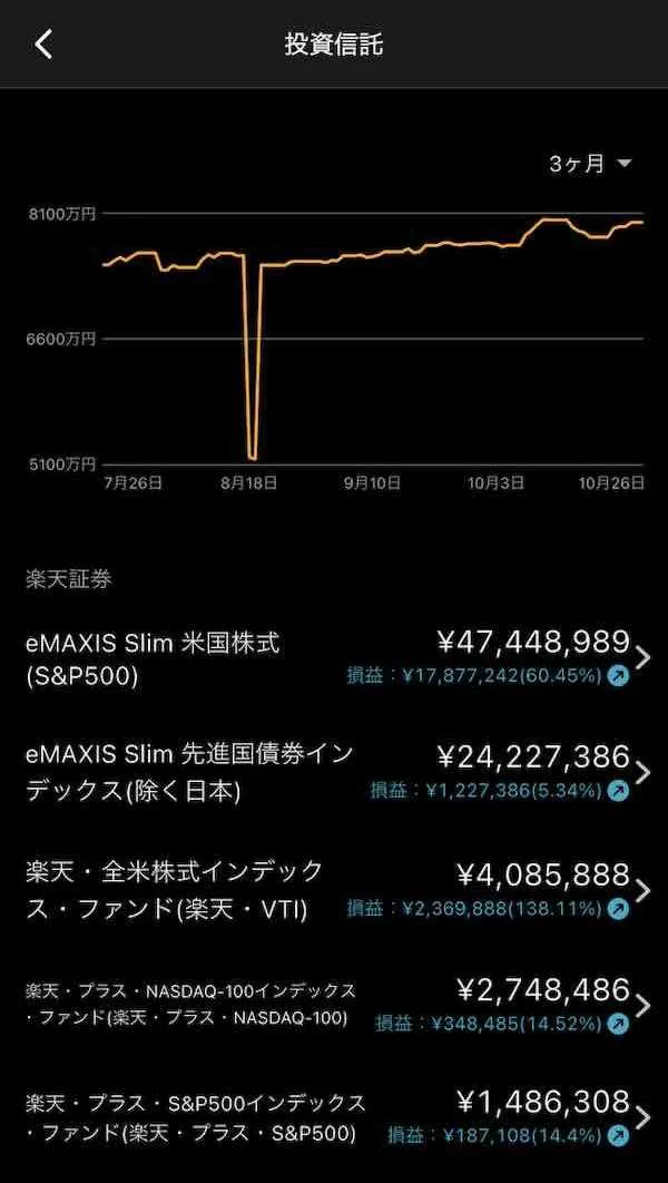 2025年10月24日時点の投資信託資産は、全体としてプラス推移となった。S&P500やNASDAQを中心とした反発が寄与し、資産総額は再び8,000万円台を視野に入れる水準まで戻している。