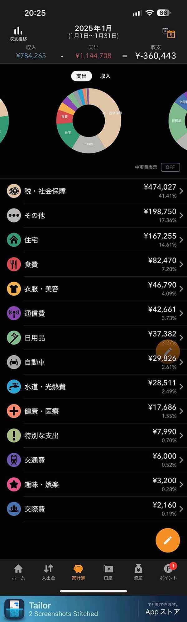 収入が784,264円、支出が1,144,708円、収支は360,443円の赤字だった。支出のうち、「税・社会保障」が474,027円(全体の41.41%)、「その他」(ペット関連費用)が198,750円(全体の17.36%)で、これら2項目の割合が大きく支出が跳ね上がった結果となった。