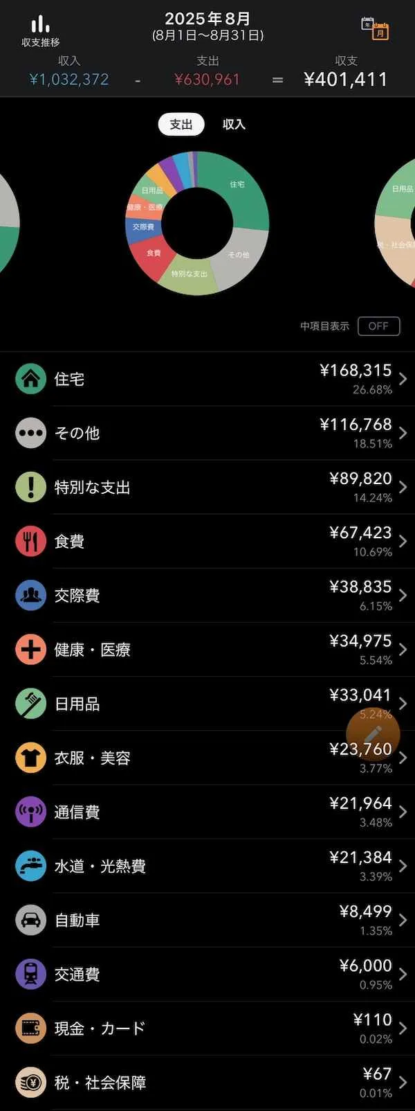 2025年8月の家計簿を集計したところ、収入は1,032,372円、支出は630,961円、収支はプラス401,411円となった。7月は傷病手当給付金の終了により大幅な赤字となったが、8月は国民健康保険の還付金が約78万円発生したことで大きな黒字となった。以下、特に通常月と比べて高額になった項目を中心に振り返る。