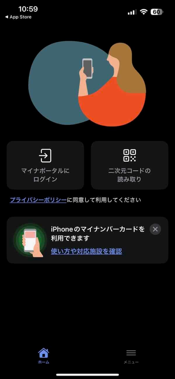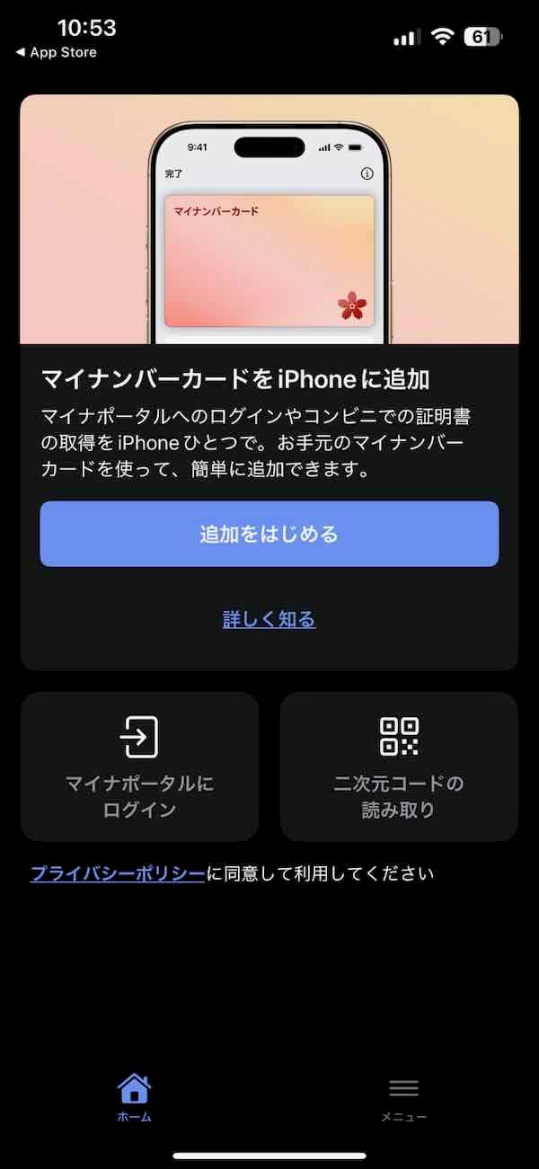 無事にマイナポータルアプリのトップページに「iPhoneのマイナンバーカードを利用できます」と表示された。