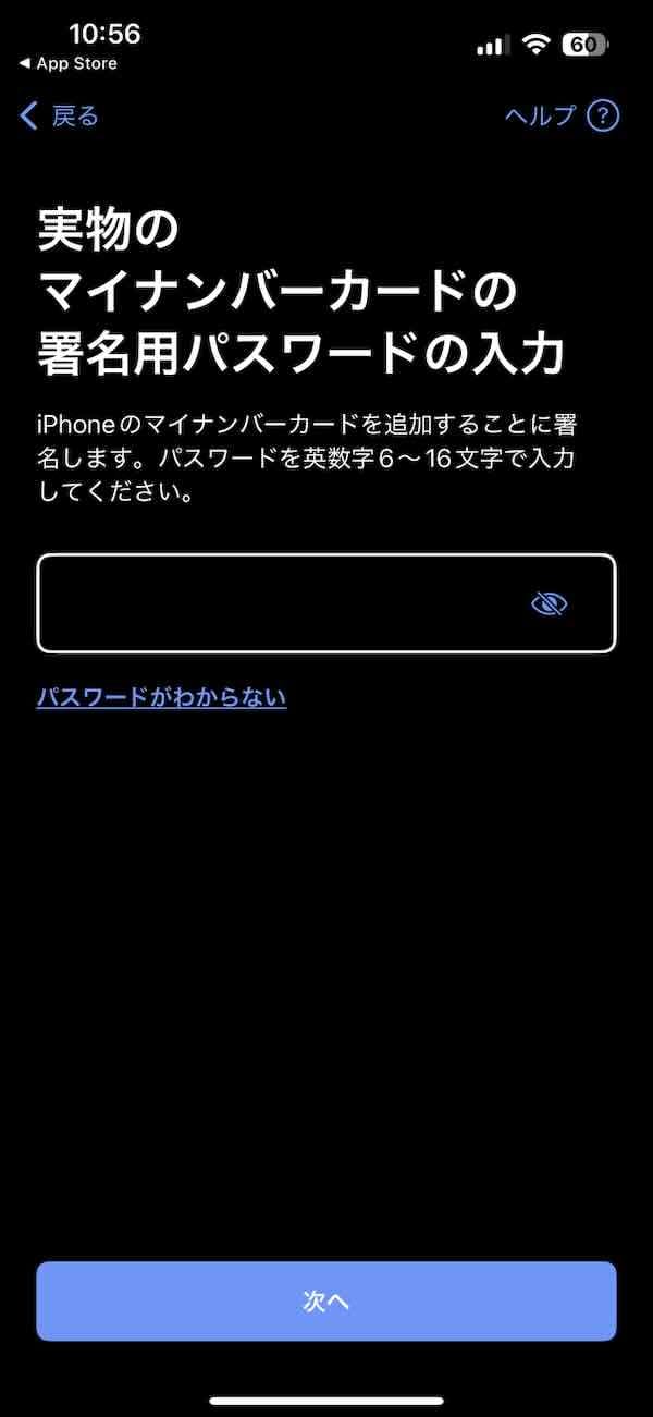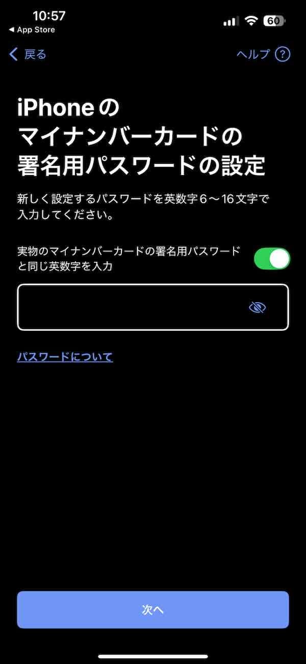 こちらも忘れないように実物のマイナンバーカードと同じパスワードを設定した。「実物のマイナンバーカードの署名用パスワードと同じ英数字を入力」をオンにすると自動で入力される。