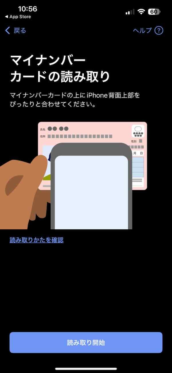 iPhoneの背面カメラの下部あたりにマイナンバーカードを重ねるようにしてかざす。NFC機能により自動でカード情報が読み取られる。数秒〜十数秒ほどで読み取りが完了。