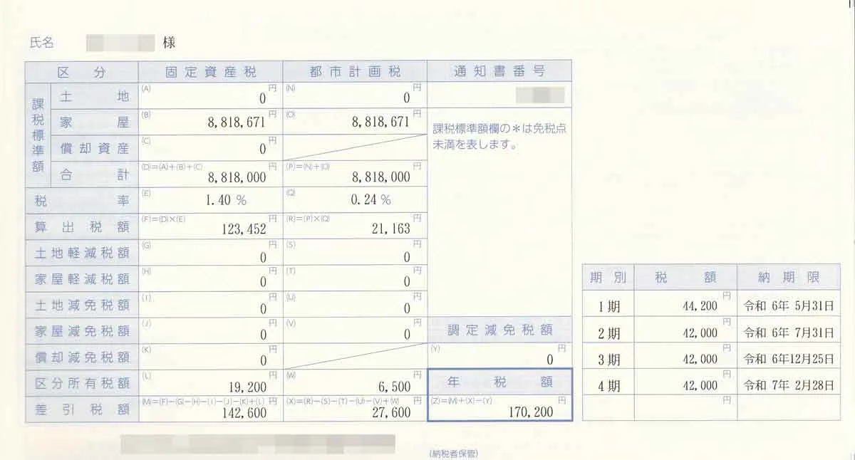 では私が前年度に納税した固定資産税・都市計画税の実際の金額を見てみよう。年税額は合計で170,200円、内固定資産税額が142,600円、都市計画税額が27,600円。納付回数は4回で1期のみ44,200円、それ以降は42,000円だった。