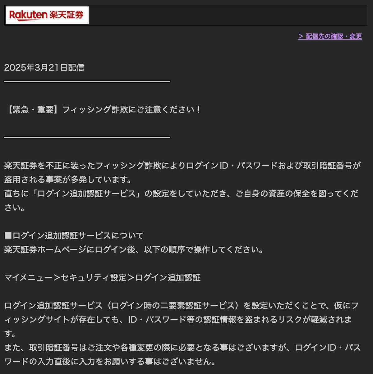 楽天証券が緊急の注意喚起を行った背景には、巧妙化するフィッシング詐欺の脅威がある。特に証券口座を狙った攻撃は個人資産に直結するため、対策は急務である。