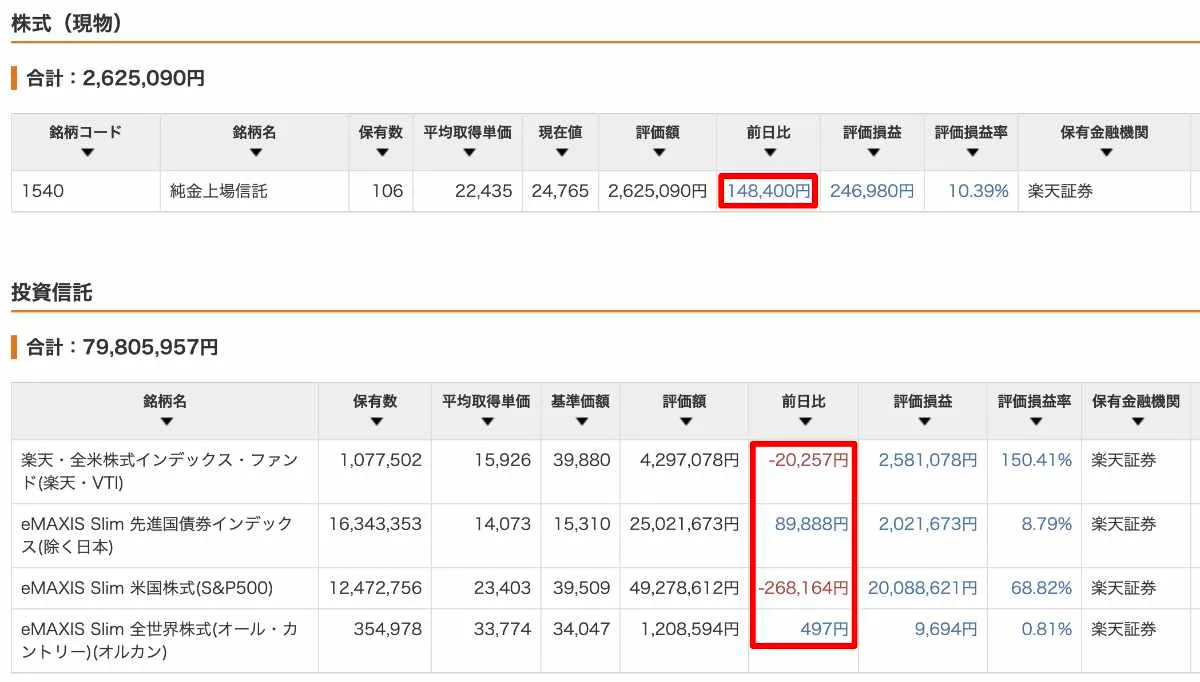 米国株式を代表するS&P500連動ファンドは、前日比で約26.8万円の下落となった。全米株式型ファンド(VTI)も約2万円のマイナスである。一方で、金と先進国債券は明確にプラスとなった。