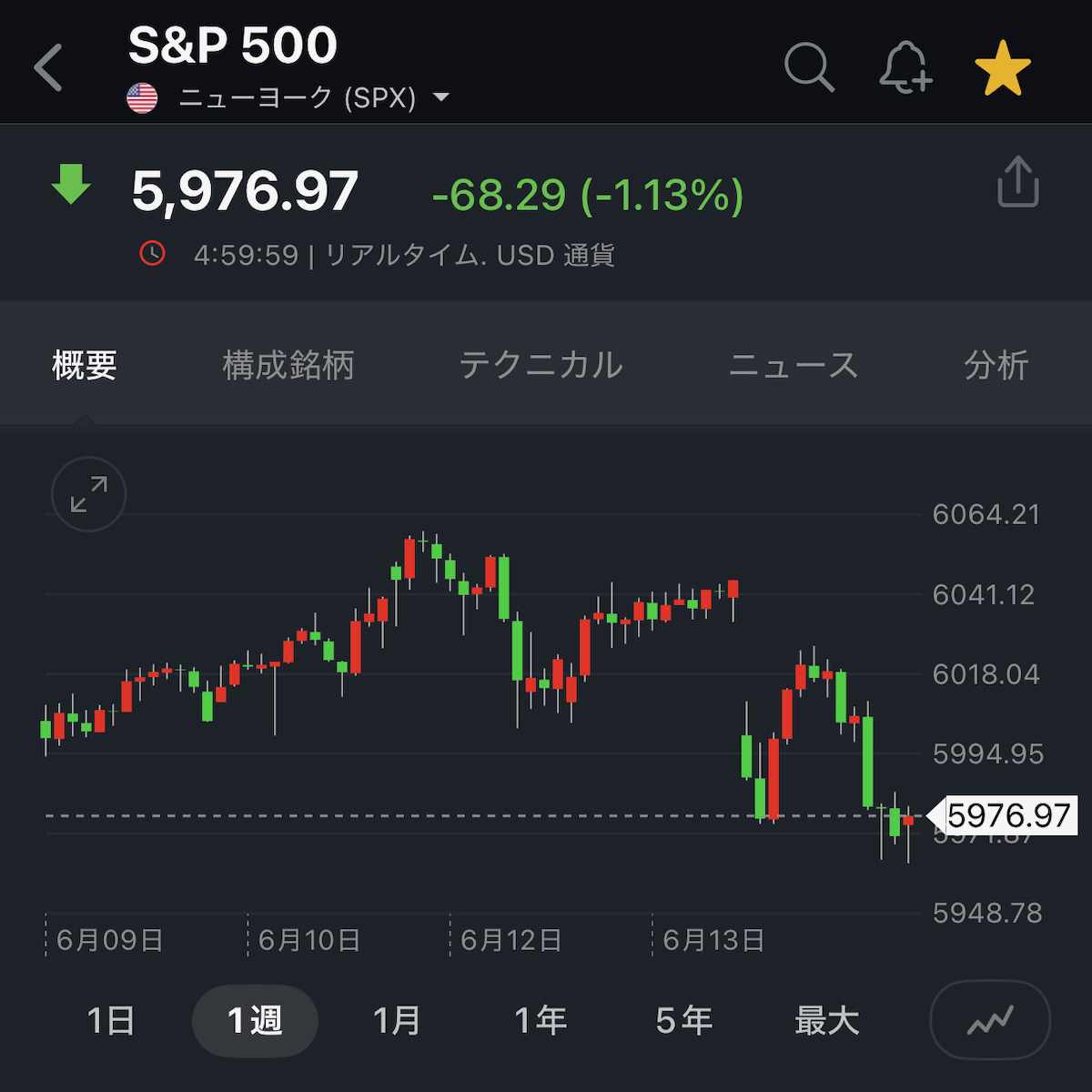 2025年6月9日週のS&P500は、週末にかけて軟調な展開となり、結果として週間ベースでは下落した。終値は5,976.97ポイントとなり、前週終値である6,000.36ポイント(6月7日終値)から23.39ポイント、率にして約0.39%の下落である。