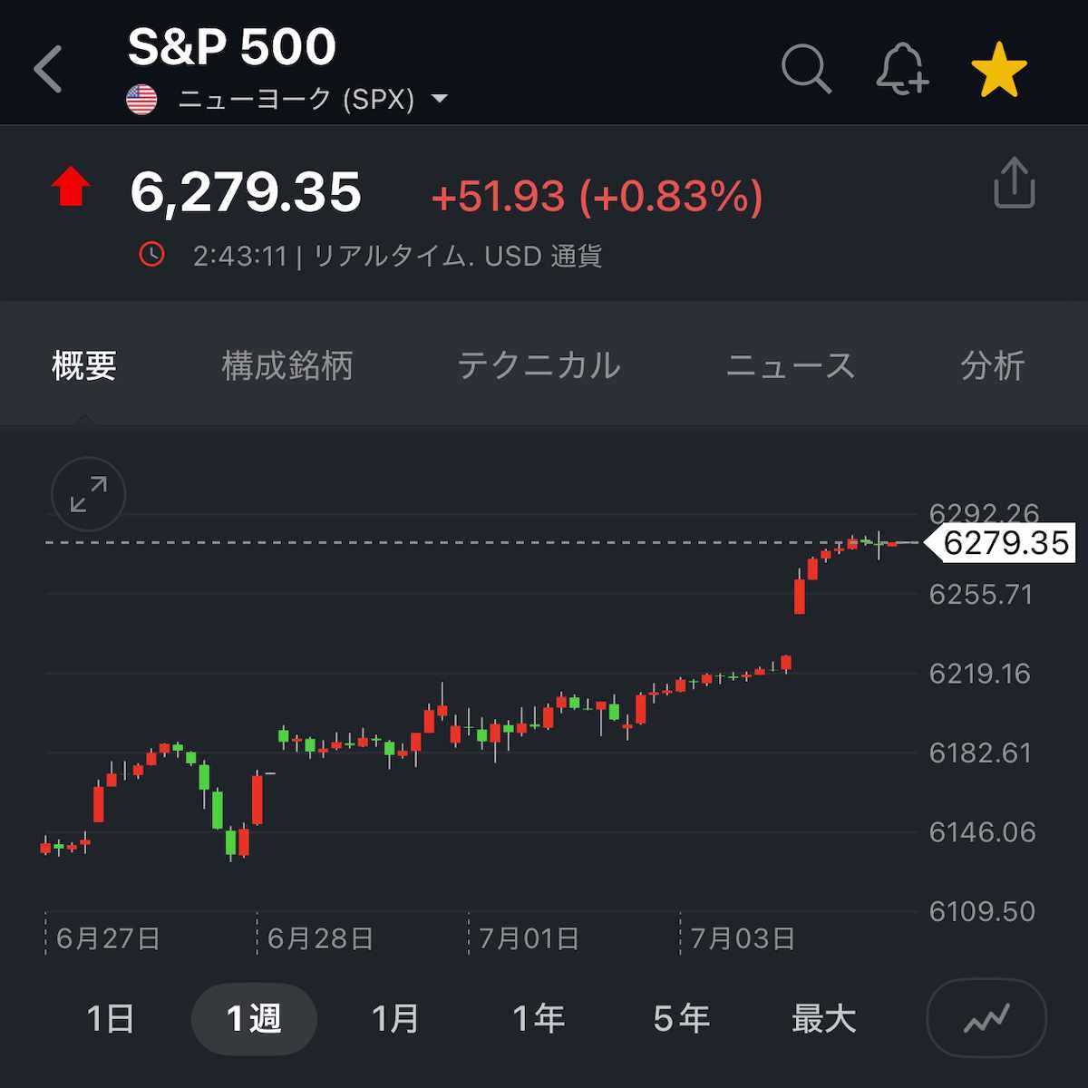 2025年6月30日週のS&P500は、米独立記念日による休場を挟みながらも前週比+1.72%の上昇を記録し、終値ベースで6,279.35ポイントと史上最高値を再び更新した。